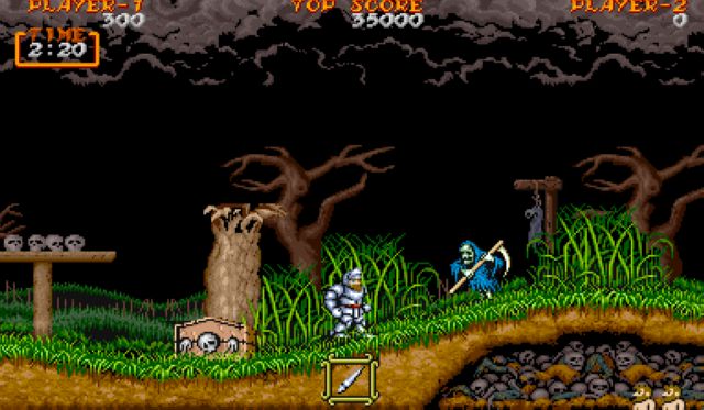 Das im Jahr 1985 für Arcade-Automaten, C64, NES und andere Konsolen erschienene Spiel Ghouls ‘n Ghosts war schwer. Sehr schwer. Zwar hatte Ritter Arthur diverse Waffen bzw. Wurfgeschosse wie Pfeile, Lanzen und Fackeln zur Verfügung, um seine geliebte Prinzessin zu retten, doch bezahlte er jeden noch so kleinen Fehler im Kampf gegen Gargoyles, Zombies und anderes Getier zuerst mit seiner Rüstung, dann mit seinem Leben. Der Nachfolger Super Ghouls ‘n Ghosts für den SNES 1991 war ein bisschen gnädiger – was jedoch im Licht seines beinahe unmöglichen Vorgängers als ein schwacher Trost erscheint. Das Gameplay ist im Grossen und Ganzen gleich geblieben: Arthur springt von links nach rechts, sammelt Waffen oder Rüstungsupgrades in (versteckten) Kisten auf und versucht sich so gut es geht seiner Haut zu erwehren. Tricky: manche Waffen sind praktische als andere, haben dafür schwächere aufladbare Magieattacken (die man der goldenen Rüstung bekommt). Ebenfalls für Weinkrämpfe sorgt der Doppelsprung; der mag praktisch sein, wenn es darum geht, grosse Abgründe zu überwinden, doch der Nachteil liegt darin, dass man die Sprungrichtung, einmal in der Luft, nicht ändern kann und bei einem falsch getimten Sprung zwangsläufig seinem Untergang entgegenstürzt (und das auch noch in Unterhosen). Wie für SNES-Spiele zur damaligen Zeit üblich, existiert keine Speicherfunktion. Der Spieler ist dazu herausgefordert, den Höllentrip in einem Rutsch durchzuspielen – Verzeihung, zwei Mal (but our princess is in another castle). Beim zweiten Mal erhält man ein spezielles Item, welches das richtige Ending herbeiführt.