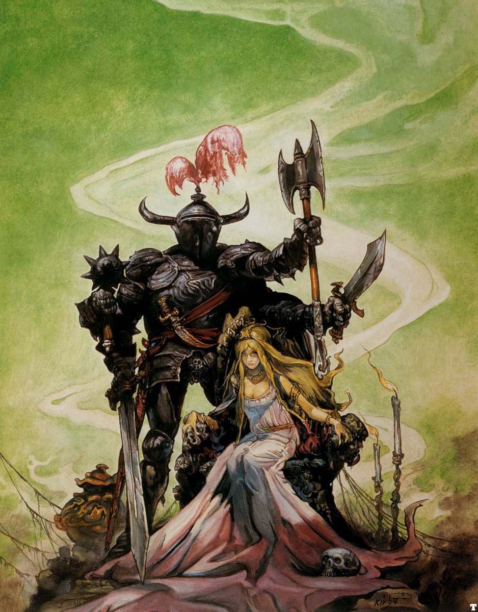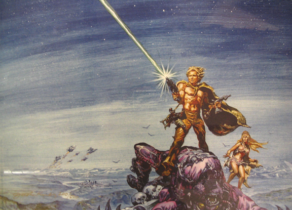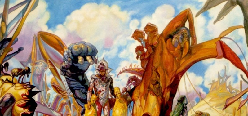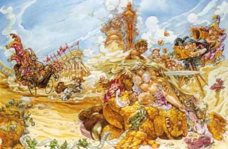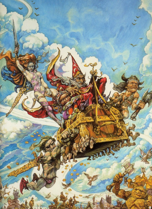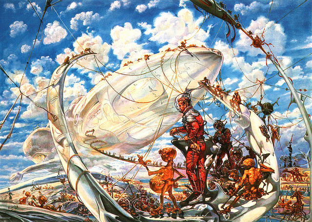 Ein rosaroter Yoshi, der Gegner aufsaugen kann? Nein, Josh Kirby ist nicht die Mischung zweier Nintendo-Helden, sondern war Maler und Illustrator allseits geliebter Pulp-Hefte und Bücher. Am bekanntesten wurde er für die Covers von Terry Pratchetts Scheibenwelt-Romanen. Über die literarische Qualität dieser Bücher lässt sich streiten, und den letzten Scheibenwelt-Roman legte ich nach zwei Seiten weg, aber darum soll es hier nicht gehen. Kirby wurde 1928 in England geboren und starb 2001. Wie schon bei Yoshitaka Amano besteht sein Werk aus einer eigentümlichen Mischung aus Lohnarbeit und Kunst. Was den Stil angeht, so sollte man nicht den Fehler machen, in Kirby bloss den humoristischen Satiriker zu sehen. Lange vor Pratchett zeichnete er bereits Filmplakate, Covers verschiedener SF-Magazine oder sogenannte „Game books“, welche wohl Ernst durchscheinen lassen – wie ernst man seine Welten auch nehmen will. Berühmtheit erlangte das Plakat zu Monty Pythons „Life of Brian“, aber auch eigene Werke (wie das quasireligiöse SF-Portfolio „Voyage of the Ayeguy“, Bild 3 und 4) sollten nicht ausser Acht gelassen werden.