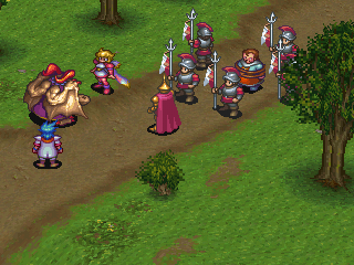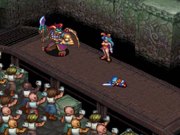 Die Stärke von Breath of Fire III liegt dafür einmal mehr – wär hätte es gedacht? – im Figurendesign. Vogelfrau Nina ist wieder dabei, hinzu kommen Zwiebel (ja, Zwiebel) Peco und Koloss Garr. Dabei schlüpfen leider auch ein paar RPG-Klischees ins Game, wie die technikbegeisterte Draufgängerin Momo; Chrono Trigger lässt grüssen. Was die Charaktere selbst angeht, so sind die leider wieder so flach wie im archaischen ersten Teil aus dem Jahr 1993, wenn nicht sogar flacher. Überhaupt lässt sich langsam, aber sicher eine Art Müdigkeit ausmachen, was die Drapierung der Welt anbelangt. Wir haben das obligatorische Geisterschiff, den Vulkan, das Kolosseum, einen Tyrannen, schale Running Gags … vor der Teilrevolutionierung des Genres (Final Fantasy 7) lag der Wind still, und das merkt man bei BoFIII leider besonders deutlich. Noch hat man es nicht mit SF und Industrial zu tun, Fernem Osten und Cyberspace. Alles bewegt sich auf bekanntem Gebiet und verlässt nur selten, wenn überhaupt, die ausgetretenen Pfade. Daran kann auch das Kampfsystem nicht viel ändern, obwohl erstmals die Meister eingeführt werden, die einem freiere Hand bei der Erlernung von Fähigkeiten und der Spezialisierung auf Kampf oder Magie erlauben. Das System steckte damals noch in den Kinderschuhen, es wird nichts erklärt, und so kann es passieren, dass ein unaufmerksamer Spieler die Funktionsweise der Meister überhaupt nicht mitkriegt. Wie auch später bei Teil 4 lassen sich die erlernten Fähigkeiten im Camp auf der Weltkarte zwischen den Charakteren austauschen. Das hilft, wenn es mal ans Eingemachte geht, sprich zu einem Bosskampf kommt. Die Bosse im Spiel sind teilweise erstaunlich hart und ohne die richtige Strategie ist mit ihnen nicht gut Kirschen essen. Auf Schutzzauber und Hilfsitems ist man in vielen dieser Kämpfe mehr als angewiesen, zumal die vorangehenden ausgedehnten Dungeons voller Fallen sind, welche die Party ordentlich schwächen. Die Zufallskampfrate ist verglichen mit den PS1-FFs sehr hoch, verglichen mit BoF2 schon sehr viel niedriger. Jedenfalls erwartet einen kein Zuckerschlecken, und ohne Grinding (im Kreis rennen und aufleveln) im ersten Drittel des Spiels sollte man es gar nicht erst versuchen. Wenn man sich erstmal ein paar Level hochgeschraubt und eine gute Strategie zurechtgelegt hat, kommt der Spielfluss in die Gänge. Die Weltkarte ist übrigens noch keine „Karte“, sondern getreu im Stil der RPG-Urahnen (Minihäuser als Dorf usw). Ansonsten plagen das Spiel ein paar Designschwächen: Charaktere müssen in den ungünstigsten Zeitpunkten ausgewechselt werden, wenn sich z.B. mal wieder ein NPC dazu erdummt, nur mit den Frauen sprechen zu wollen, Teammitglieder bleiben stecken und laufen blind in Fallen, die Minispiele nerven nur (auch wenn es zum Glück weniger sind als in Teil 4). Die Haare raufen wird man sich auch in den Shops – die Waffen und Rüstungen sind so teuer, dass man stundenlang trainieren muss, nur um das nötige Kleingeld zusammenzukriegen. Ärgerlich, aber auch verständlich ist, dass fast alle gröberen Waffen empfindlich den Wert für die Schnelligkeit senken. Die meisten Gegenstände (ausser Antidots, Vitamine bzw. Kräuter und MP-Auffrischer) bringen es im Übrigen nicht wirklich. Fischen kann man wie üblich, und ein Feendorf aufbauen. Die Bewirtschaftung geht allerdings etwas verknorzter vonstatten als in BoFIV. Ein Wort muss auch zur Übersetzung verloren werden. Diese bewegt sich im unteren Niveaubereich, Schreibfehler, Stilblüten und Fehlübersetzungen sind überall zu finden. Wer auf die Idee kam, den Dorfältesten des Drachenclans Bono zu nennen, verdient eine Medaille. Den Gipfel der Seltsamkeit bildet ein hessisch sprechender Delfinboss. Ja, was zur Hölle, hessisch. Hessisch! Mangels englischer Version konnte diese Entscheidung nicht nachempfunden werden, wahrscheinlich erlaubten sich die Übersetzer einen dummen Scherz.