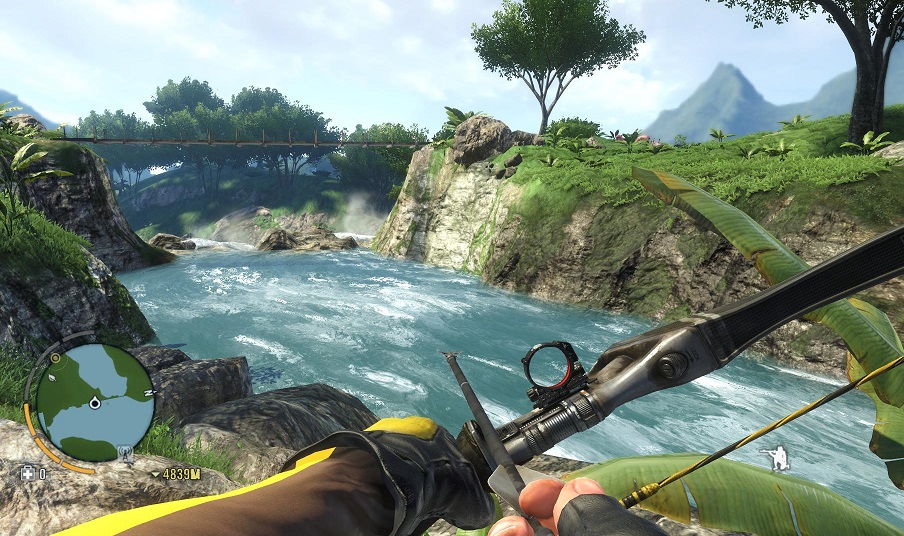 Technisch hat die PS3 also etwas zu bewältigen. Sie schafft es mehr schlecht als recht: das Spiel leidet an dem für Open World-Spiele allzu bekannten Problem der verspätet ladenden Texturen. (Bestes Beispiel dafür ist wohl GTA San Andreas). Manche Bugs verhindern ausserdem das Abschliessen einer Jagdmission. So tauchte einmal einer der fünf Hirsche nicht mehr auf, die man per Scharfschützengewehr erledigen sollte. Der schlimmste Bug ist aber wohl der bodenlose Abgrund, der sich Jason bei einem falschen Schritt auftut. Im nächsten Moment fällt er durch den Meeresgrund hindurch, um plötzlich am Himmelsfirnament aufzutauchen. Dass man in diesem Niemandsland dann auch noch den Wingsuit benutzen kann, ist der Gipfel der Absurdität. Der Rest geht mehr oder weniger in Ordnung. Die Musik gibt 2-3 Glanzmomente in wichtigen Storyszenen her, ansonsten plätschert sie im Hintergrund, um nicht abzulenken. Beim Benutzen eines Fahrzeugs läuft gemütlicher Reggae-Sound. Toll!