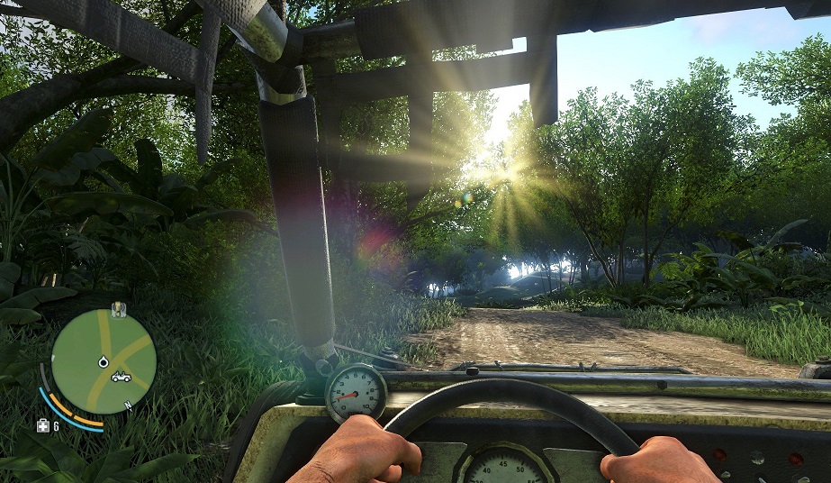 Abseits der geskripteten Events bietet Far Cry 3 eine riesige, offene Inselwelt, die nach Lust und Laune erkundet werden darf. Die spannende Topografie mit ihren Bergen, Wäldern, Flüssen und Seen wird mit Fahrzeugen aller Art erobert, sei es Quadbike, Motorboot oder rostiges Auto. Sogar ein Wingsuit und Paragleiter sind mit dabei. Die wunderschöne Landschaft mit ihren Sonnenuntergängen erinnert in ihrer sorgfältigen Umsetzung an ein Red Dead Redemption in den Tropen. Nicht nur Menschen bevölkern die Insel, sondern auch Tiere: Hirsche, Dingos, Wildschweine, Krokodile, Warane, Tiger, Bären, Vögel, … der Dschungel strotzt vor Lebendigkeit auf engstem Raum. So kann es oft vorkommen, dass einem während der Jagd nach Waranen ein Tiger sprichwörtlich in den Rücken fällt, oder, noch schlimmer, während man gegen Piraten kämpft. Droht Frust aufzukommen, ist es immerhin jederzeit möglich, per Schnellreise an einen beliebigen Aussenposten oder in ein Dorf versetzt zu werden. Eine Option, von der man früher oder später gerne gebrauch macht, denn die Welt ist wirklich gross und die Fahrwege unberechenbar. Die Dörfer bestehen zum Grossteil aus Baracken und ärmlichen Hütten. Nichts Spektakuläres, aber die Natur hat das Ihrige zu bieten.