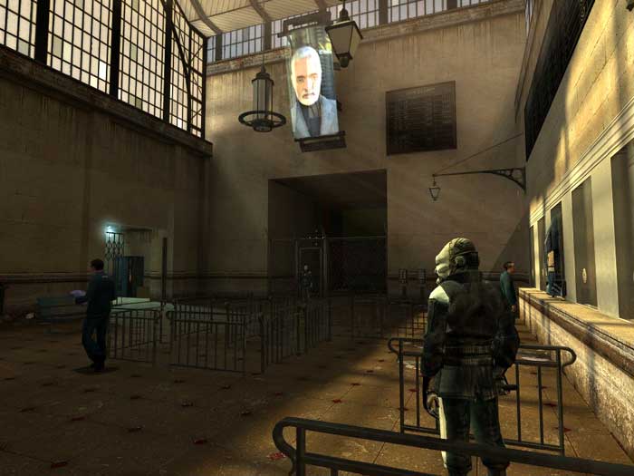 Man erinnere sich an das Ende von Half-Life 1: ein mysteriöser G-Man nahm Freeman unter seine Fittiche und liess etwas von vagen Anweisungen verlauten. Derselbe Mann mit den durchdringenden Augen und dem Aktenköfferchen begegnet uns auch zu Beginn des zweiten Teils. Wieder sind seine Andeutungen verworren und unklar, aber der Zug, in dem wir uns befinden, bringt uns nach City 17, einer der letzten Bastionen der Menschheit nach dem Angriff der Combine. Das sind die Aliens aus dem ersten Teil, die wegen eines missglückten Experiments im Black-Mesa-Forschungsinstitut durch Dimensionstore über uns herfielen. Dr. Breen, ein ehemaliger Mitarbeiter des Forschungsinstituts, herrscht als ruchloser Diktator über die Stadt und will mit den Ausserirdischen gemeinsame Sache machen. Die Bevölkerung wird mit rigorosen Polizeikontrollen an der kurzen Leine gehalten, Kameradrohnen schweben durch die Strassen, in zerfallenen, schmutzigen Wohnblocks kauern geplagte Gestalten. Einzig und allein eine Gruppe von Aufständischen, geschart um Eli Vance, dessen Tochter Alyx und einigen anderen, wagt den Kampf gegen den fanatischen Breen, der die Menschen zum „ewigen Leben“ führen will. Freeman muss sich ihnen zwangsläufig anschliessen. Das Grundgerüst von Half-Life 2 ist eine einfache Revolutionsgeschichte im Sci-Fi-Setting, wie man sie aus einschlägigen Büchern kennt. Doch Half-Life wäre nicht Half-Life, wenn daraus nicht eine spannende Handlung gestrickt würde. Es warten Tod und Verrat, aber auch witzige Momente und nervenaufreibende Actionsequenzen auf den Spieler. Gordons Reise führt ihn zu verschiedenen Kollaborateuren in City 17, in ein Hochsicherheitsgefängnis und wieder zurück und schliesslich in die Zitadelle, das Herzstück der Stadt und Sitz von Breens Hauptquartier. Abwechselnd kämpft er sich durch alienverseuchte, enge Treppenhäuser und Gassen, legt weite Strecken mit einem Fahrzeug zurück oder kriecht durch Minenschächte. Die Geschichte ist von einem seltenen Sog, einem meisterhaft abgestimmten „feeling of progress“ begleitet, welche nicht allein durch die Handlung, sondern auch durch den Wechsel von Enge und Weite des Raums, von hektischen und ruhigen Passagen, von vertikaler und horizontaler Bewegung hervorgerufen wird. Immer wieder werden neue Spielabschnitte von kühlen, atmosphärischen Technobeats begleitet, voller Bewunderung taucht man in die Architektur der neuen Gebiete (Zitadelle!) ein. Noch lange wird man sich an die Überquerung der Metallstreben einer Brücke, an das Befehligen einer Ameisenlöwenarmee erinnern. Das Action-Feuerwerk, das später viele PS3-Spiele anstreben sollten, war hier schon beinahe in Perfektion vorhanden. Obwohl es nur einen vorbestimmten Weg gibt, wird dem Spieler nie langweilig. Mithin wird man den Eindruck nicht los, dass sich die Entwickler hinsichtlich der Fahrsequenzen bei Halo Inspiration geholt haben – was aber in diesem Fall nur etwas Gutes sein kann. Nett: wenn man das Gefährt schrottet, heissts diplomatisch, man hätte „missionskritische Ressourcen“ verschwendet.